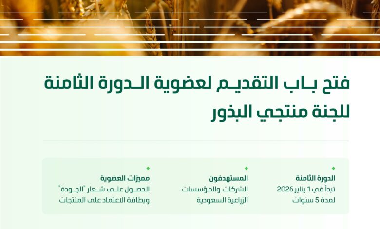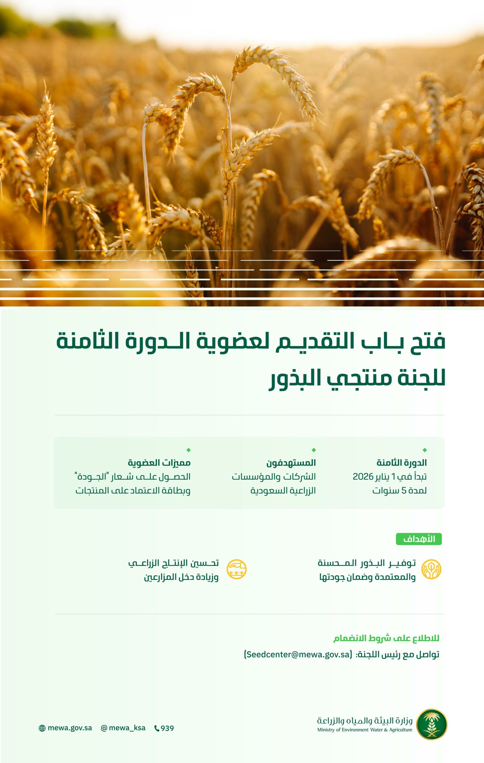أعلنت وزارة البيئة والمياه والزراعة، عن فتح باب التقديم لانضمام الشركات والمؤسسات الزراعية الوطنية لعضوية لجنة منتجي البذور في دورتها الثامنة، التي ستبدأ اعتبارًا من 1 يناير 2026م لمدة (5) سنوات، وذلك وفقًا لشروط الانضمام المعلنة.