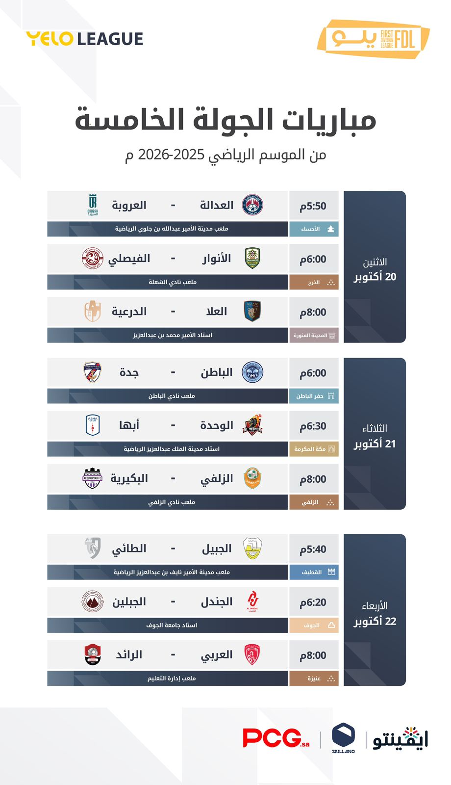 تنطلق الجولة الخامسة من بطولة دوري يلو للمحترفين الاثنين 20 أكتوبر 2025 في جولة مثيرة قد تشهد تبادل في مراكز سلم ترتيب الأندية بالدوري، حيث شهدت الجولات الأربع الماضية من دوري يلو لأندية الدرجة الأولى للمحترفين تنافسًا مثيرًا في المراكز الأولى، حيث اشتعل الصراع بين فرق العلا، والدرعية، والجبلين، والعروبة، قبل فترة التوقف الدولي الحالية، وتَعِد الجولات المقبلة من دوري يلو بمزيدٍ من الإثارة والندية، في ظل الفوارق النقطية بين فرق المقدمة، ما يجعل كل نقطةٍ ثمينة وكل مواجهةٍ حاسمة في سباقٍ طويل نحو تحقيق حلم الصعود.