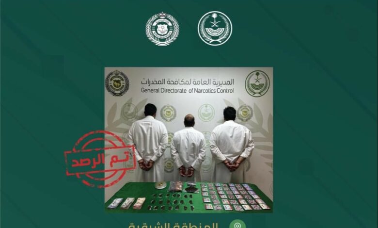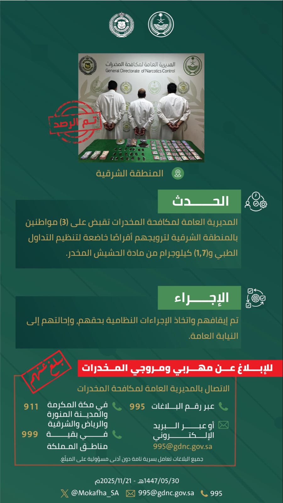 قبضت المديرية العامة لمكافحة المخدرات بالمنطقة الشرقية على ثلاثة مواطنين لترويجهم ، ماوزنه (1,795) كيلو من مادة الحشيش المخدر ،وعدد (604) حبات من حبوب البريجابالين الخاضعة للتداول الطبي,ومبلغ مالي قدرة (30,000)ريال من عوائد الاتجار بالمواد المخدرة ،وجرى إيقافهم واتخاذ الإجراءات النظامية بحقهم، وإحالتهم إلى النيابة العامة.