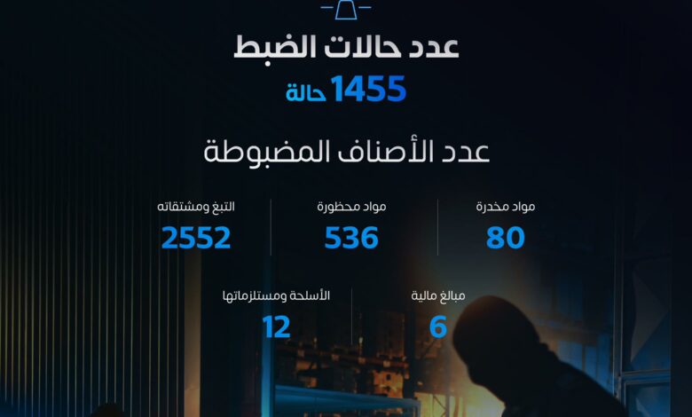 سجلت المنافذ الجمركية البرية والبحرية والجوية 1455 حالة ضبط للممنوعات، وذلك في إطار الجهود المستمرة التي تبذلها هيئة الزكاة والضريبة والجمارك “زاتكا” لتعزيز الجانب الأمني وحماية المجتمع من الممنوعات بمختلف أنواعها وأشكالها.