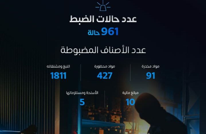 سجلت المنافذ الجمركية البرية والبحرية والجوية 961 حالة ضبط للممنوعات، وذلك في إطار الجهود المستمرة التي تبذلها هيئة الزكاة والضريبة والجمارك “زاتكا” لتعزيز الجانب الأمني وحماية المجتمع من الممنوعات بمختلف أنواعها وأشكالها.