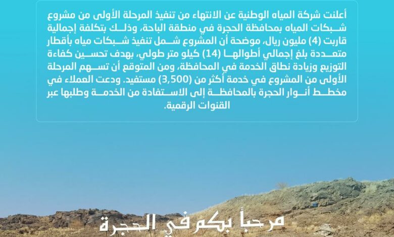 أعلنت شركة المياه الوطنية عن الانتهاء من تنفيذ المرحلة الأولى من مشروع شبكات المياه بمحافظة الحجرة في منطقة الباحة، وذلك بتكلفة إجمالية قاربت (4) مليون ريال، ويأتي هذا المشروع ضمن جهود الشركة المستمرة لتعزيز البنية التحتية لقطاع المياه، والارتقاء بجودة الخدمات المقدمة للمستفيدين، بما ينسجم مع مستهدفات رؤية السعودية 2030 وبرامج تحسين جودة الحياة.