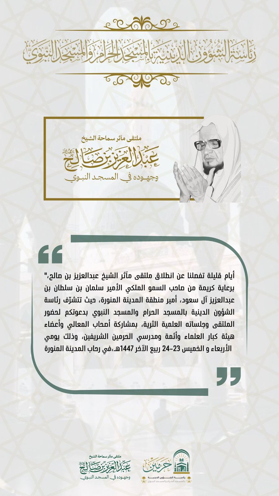 ‎أيام قليلة تفصلنا عن انطلاق ملتقى مآثر الشيخ عبدالعزيز بن صالح، برعاية كريمة من صاحب السمو الملكي الأمير سلمان بن سلطان بن عبدالعزيز آل سعود، أمير منطقة المدينة المنورة، حيث تتشرّف رئاسة الشؤون الدينية بالمسجد الحرام والمسجد النبوي بدعوتكم لحضور الملتقى وجلساته العلمية الثرية، بمشاركة أصحاب المعالي وأعضاء هيئة كبار العلماء وأئمة ومدرسي الحرمين الشريفين، وذلك يومي الثلاثاء والأربعاء 23–24 ربيع الآخر 1447هـ، في رحاب المدينة المنورة.”