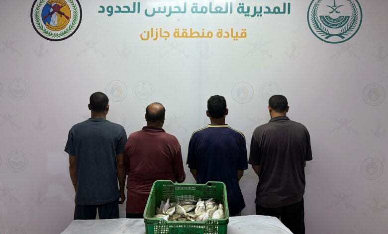 ضبطت الدوريات الساحلية لحرس الحدود في محافظة بيش بمنطقة جازان (4) مقيمين من الجنسية المصرية مخالفين للائحة الأمن والسلامة لمزاولي الأنشطة البحرية في المناطق البحرية للمملكة العربية السعودية، وذلك لممارستهم الصيد دون تصريح بمنطقة محظورة، وبحوزتهم أسماك مصيدة، وتم اتخاذ الإجراءات النظامية بحقهم بالتنسيق مع الجهات المختصة.