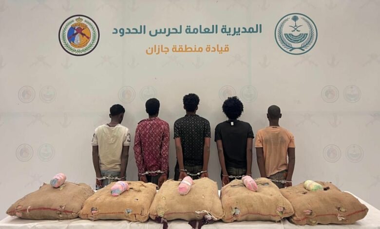 حرس الحدود بمنطقة جازان يقبض على (5) مخالفين لنظام أمن الحدود لتهريبهم (100) كيلوجرام من نبات القات المخدر