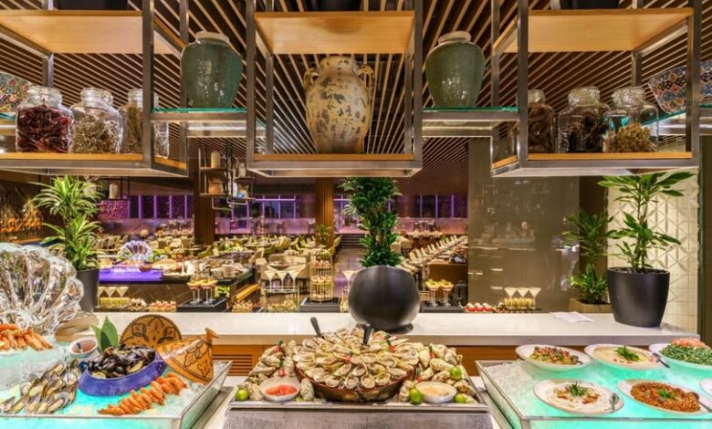 يقدّم المكان مغامرة طهي عالمية تبدأ مع مجموعة مختارة بعناية من المقبلات الطازجة، والخبز، والسلطات، والأجبان الفاخرة، كما يمكن لعشاق السوشي تجربته مباشرةً من محطة السوشي الحيّة لتذوق نكهات المطبخ الياباني الأصيلة والمحضّرة بمهارة عالية. أما الأطباق الرئيسية فتحتضن تشكيلةً غنية تضم اللحوم المشوية بإتقان على النار المفتوحة، وأطباق الباستا الشهية. ويمكن للضيوف تجربة أطباق ترقى لأذواقهم المختلفة في محطة المأكولات البحرية، بالإضافة إلى تشكيلة من أطباق الكاري المتبّلة ومجموعة واسعة من المأكولات العالمية التي تلبي كافة الأذواق.