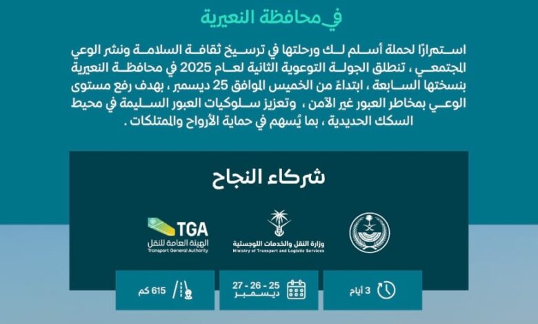 تُعلن الخطوط الحديدية السعودية “سار” عن انطلاق الجولة الثانية من حملتها الميدانية للتوعية بالسلامة “أسلم لك” لعام 2025، وذلك ضمن دورتها السابعة، والتي تبدأ من محافظة النعيرية اعتبارًا من يوم الخميس الموافق 25 ديسمبر 2025م، وتمتد على مدار ثلاثة أيام، وتأتي هذه الجولة امتدادًا لجهود “سار” المستمرة في تعزيز مستويات السلامة على امتداد شبكة السكك الحديدية، ورفع الوعي المجتمعي بمخاطر العبور غير النظامي، بما يسهم في حماية الأرواح والممتلكات العامة والخاصة.