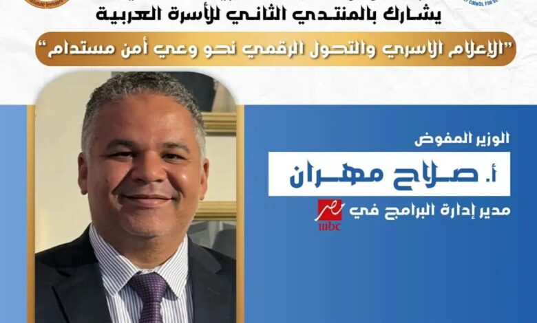 قد تكون صورة ‏تحتوي على النص '‏O انصريد الجردة الموتمر الدولي الخامس عشر للاتحاد العربي للتنمية المستدامة والبئية مجلس الأسرة التربية للتنمية يشارك بالمنتدي الثاني للأسرة الععربية الاإعلام" الاسري والتحول الرقمي نحو وعي أمن مستدام کان CINGL الوزير المفوض .i أ.صلاح مهران مدير إدارة البرامج في صر mbc 2025 DEC 8 States Arab of League غججش‏'‏