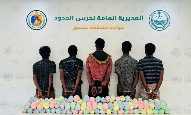 قبضت الدوريات البرية لحرس الحدود في قطاع الربوعة بمنطقة عسير على (5) مخالفين لنظام أمن الحدود من الجنسية الإثيوبية، لتهريبهم (100) كيلوجرام من نبات القات المخدر، وجرى استكمال الإجراءات النظامية الأولية بحقهم، وتسليمهم والمضبوطات لجهة الاختصاص.