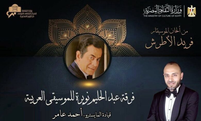 ضمن خطط وزارة الثقافة لصون الارث الإبداعى والإحتفاء برموزه تستهل دار الأوبرا المصرية برئاسة الدكتور علاء عبد السلام سلسلة عروضها لإحياء ذكرى رحيل الموسيقار فريد الأطرش وتبدأ بحفل لفرقة عبد الحليم نويره للموسيقى العربية بقيادة المايسترو أحمد عامر يقام فى الثامنة مساء الخميس ٢٧ نوفمبر على المسرح الكبير ويتضمن مختارات من أعمال ملك العود منها هلت ليالى، ياساعة بالوقت أجرى، أحلفلك ما تصدقش، ما إنحرمش، ليالى الأنس وغيرها .. آداء محمد حسن، مصطفى النجدى، حسام حسنى، رحاب مطاوع، وليد حيدر، سمية وجدى.