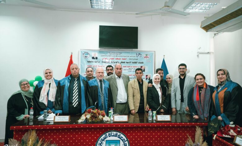 ناقشت كلية الآداب والعلوم الإنسانية جامعة قناة السويس رسالة الماجستير للباحثة “أمنية مسعد العدل زهران ” بعنوان تقنيات الكتابة الأدبية للطفل والوسائط المتعددة دراسة تحليلية” وذلك يوم الاثنين الموافق السادس من شهر أبريل الجاري لعام 2026 في تمام الساعة الحادية عشرة صباحا بقاعة المناقشات بكلية الآداب والعلوم الإنسانية جامعة قناة السويس