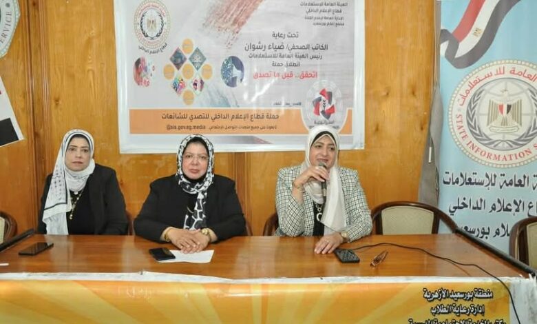 في اطار حملة ” اتحقق قبل ما تصدق ” التي اطلقها قطاع الاعلام الداخلي بالهيئةالعامة للاستعلامات بتوجيهات الكاتب الصحفي ضياء رشوان و اشراف الدكتور احمد يحيي ، عقد مجمع اعلام بورسعيد ندوة بالتعاون مع مكتب الخدمة الإجتماعية المدرسية بمنطقة بورسعيد الأزهرية ضمن قوافل الرعاية الاجتماعية التي ينظمها الأزهر الشريف والتي استهدفت عدد من معاهد بورسعيد الازهرية مرحلة اعدادي و ثانوي بنين و فتيات ،