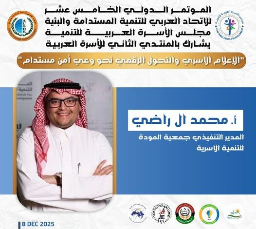 أعلن مجلس الأسرة العربية للتنمية عن اختيار الأستاذ محمد آل راضي — الرئيس التنفيذي لـ جمعية المودة للتنمية الأسرية — للفوز بجائزة “رجل العام في العمل المجتمعي الأسري” تقديرًا لمسيرته التي تجاوزت عشر سنوات من العطاء والإنجاز، وتحويله الجمعية إلى واحدة من أهم المؤسسات العربية في دعم الأسرة وتمكين المرأة وحماية الطفل.