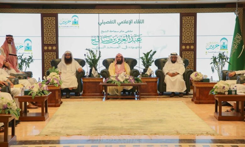 أعلن معالي الشيخ الدكتور عبدالرحمن بن عبدالعزيز السديس، رئيس الشؤون الدينية بالمسجد الحرام والمسجد النبوي، عن تفاصيل ملتقى مآثر سماحة الشيخ عبدالعزيز بن صالح – رحمه الله – وجهوده في المسجد النبوي، وذلك خلال مؤتمر إعلامي خاص عُقد في مقر وكالة رئاسة الشؤون الدينية بالمدينة المنورة، بحضور عدد من ممثلي المؤسسات والوسائل الإعلامية.