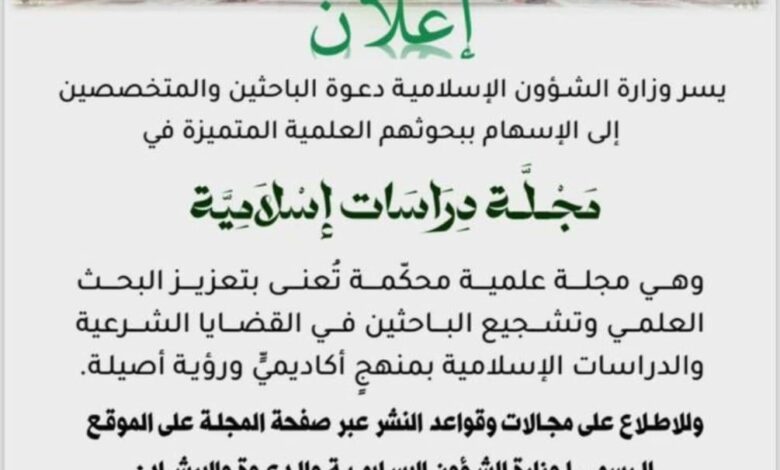دعت وزارة الشؤون الإسلامية والدعوة والإرشاد في إعلان لها الباحثين والمتخصصين الراغبين بالمشاركة في المجلة التي سوف تصدرها الوزارة ممثلة بوكالة الوزارة لشؤون المطبوعات والبحث العلمي والتي تحمل عنوان ( مجلة دراسات إسلامية ) وهي مجلة علمية محكّمة تُعنى بتعزيز البحث العلمي وتشجيع الدراسات في القضايا الشرعية والعلوم الإسلامية وفق منهج أكاديمي رصين ورؤية أصيلة ، حيث تضمن هذا الإعلان دعوة الباحثين والمتخصصين الراغبين بالإسهام ببحوثهم العلمية المتميزة للمشاركة في هذه المجلة على الاطلاع على مجالات النشر وقواعده وتقديم طلب المشاركة عبر الموقع الرسمي للوزارة ، www.moia.gov.sa حيث تستهدف المجلة الأبحاث التي تثري المكتبة الإسلامية وتساهم في تعزيز منهج الوسطية والاعتدال باهتمام وإشراف معالي وزير الشؤون الإسلامية والدعوة والإرشاد الشيخ الدكتور عبداللطيف بن عبدالعزيز آل الشيخ