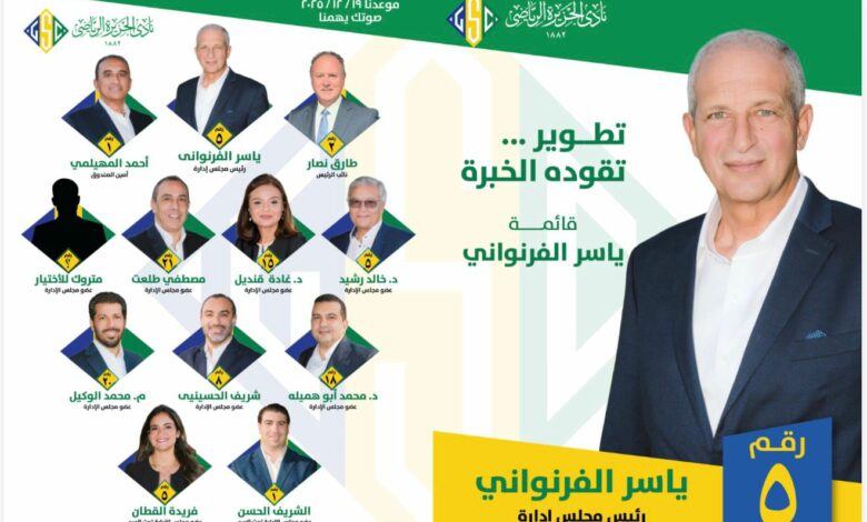 أعلن ياسر أحمد الفرنواني ترشحه رسميًا لمنصب رئيس مجلس إدارة نادي الجزيرة الرياضي (رقم 5) في الانتخابات المقررة في 19 ديسمبر 2025، وذلك على رأس قائمة انتخابية تحمل شعار «تطوير… تقوده الخبرة».