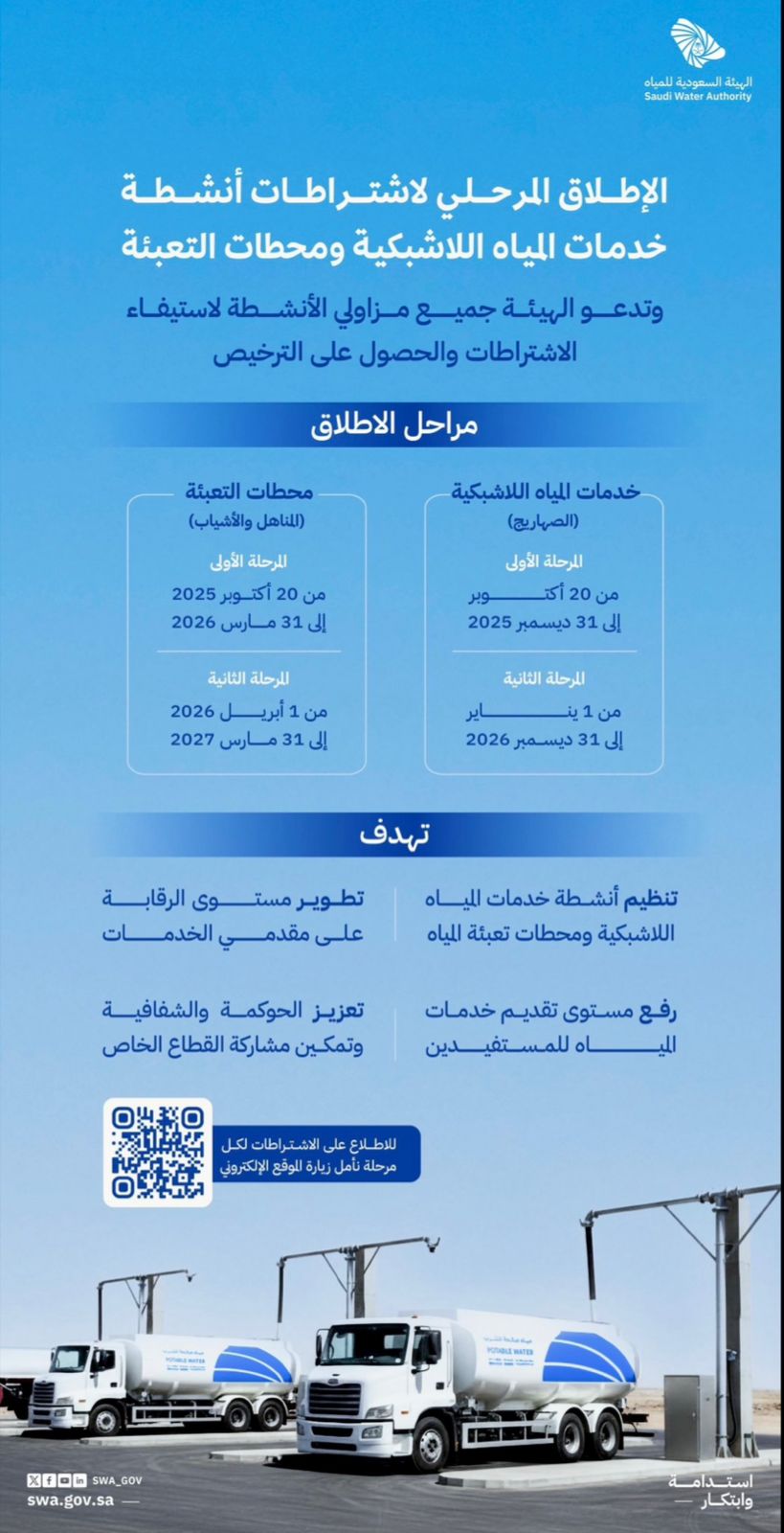 تعزيزاً لحوكمة القطاع ورفع جودة الخدمات الهيئة السعودية للمياه تبدأ الإطلاق المرحلي لاشتراطات أنشطة الخدمات اللاشبكية ومحطات تعبئة المياه، وتدعو مزاولي الأنشطة إلى الحصول على الترخيص عبر موقعها الإلكتروني.