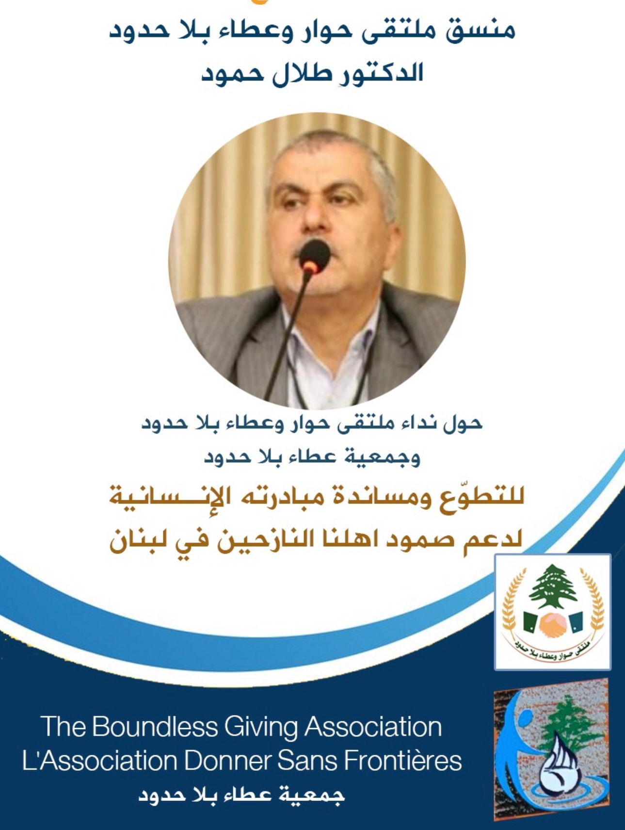 تحت شعار *كونوا دفءَ خيمةٍ ودواءَ وجع*، أطلقَ مُنسّق ملتقى حوار وعطاء بلا حدود، ورئيس ومؤسّس جمعية عطاء بلا حدود، الدكتور طلال حمود، نداءً إنسانيًّا عاجلًا من فرنسا، داعيًا إلى أوسع حملة تضامنٍ لدعم أهلنا النازحين الصامدين في مختلف المناطق اللبنانية، وجاء في بيانه: