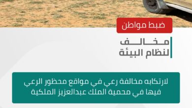 القوات الخاصة للأمن البيئي تضبط مواطنًا مخالفًا لنظام البيئة لارتكابه مخالفة رعي في محمية الملك عبدالعزيز الملكية